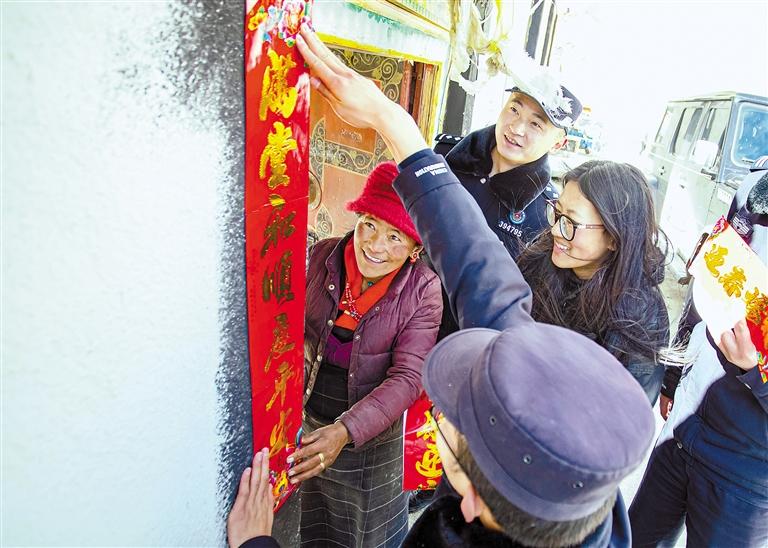 日喀则边境管理支队琼孜边境派出所民警来到“结对帮扶”群众家中,与群众一同贴春联、迎新春。通讯员 贺烈烈 崔娜 摄