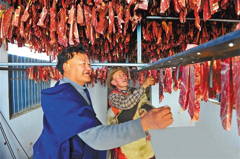 配图:上左左农牧民合作社经理桑嘎石确(左)和村委会主任罗布占堆在查看晾制的风干牦牛肉。记者 温凯 摄