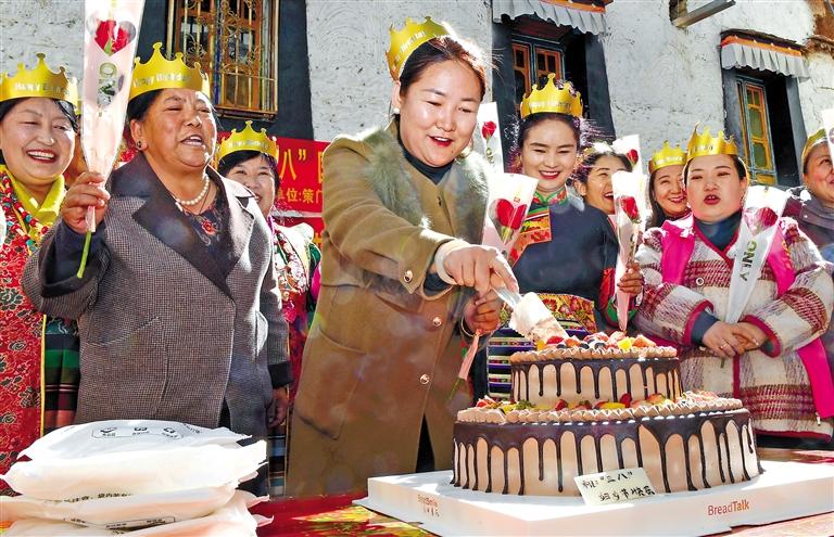 为进一步丰富社区妇女同胞的精神文化生活,展示社区巾帼风采,3月8日,拉萨市策门林社区和药王山社区共同举办了“巾帼心向党 奋进新征程‘三八’国际劳动妇女节”活动,辖区妇女欢聚一堂,庆祝节日。图为辖区女性共同切蛋糕庆祝节日。 旦增兰泽 摄