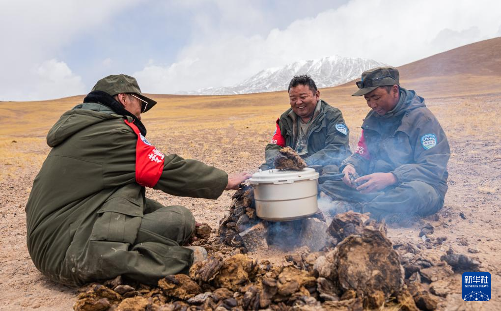 野生动物专业管护队员在巡护途中就地取材,用野牦牛粪生火做饭(5月10日摄)。新华社记者 丁增尼达 摄