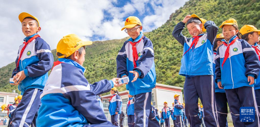 在娘蒲乡中心小学,贡乔热旦在领取课间营养餐。受益于“三包”政策,学生们每天都能吃上面包、水果、酸奶等(9月4日摄)。新华社记者 丁增尼达 摄