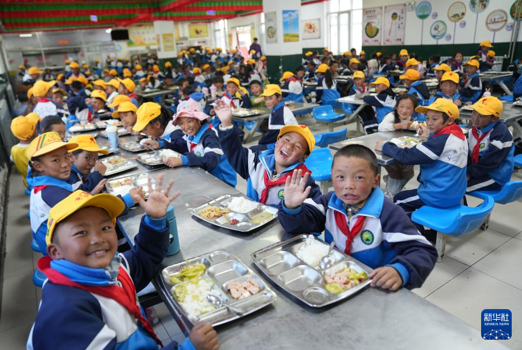娘蒲乡中心小学的学生们在享用午餐(9月3日摄)。新华社记者 晋美多吉 摄