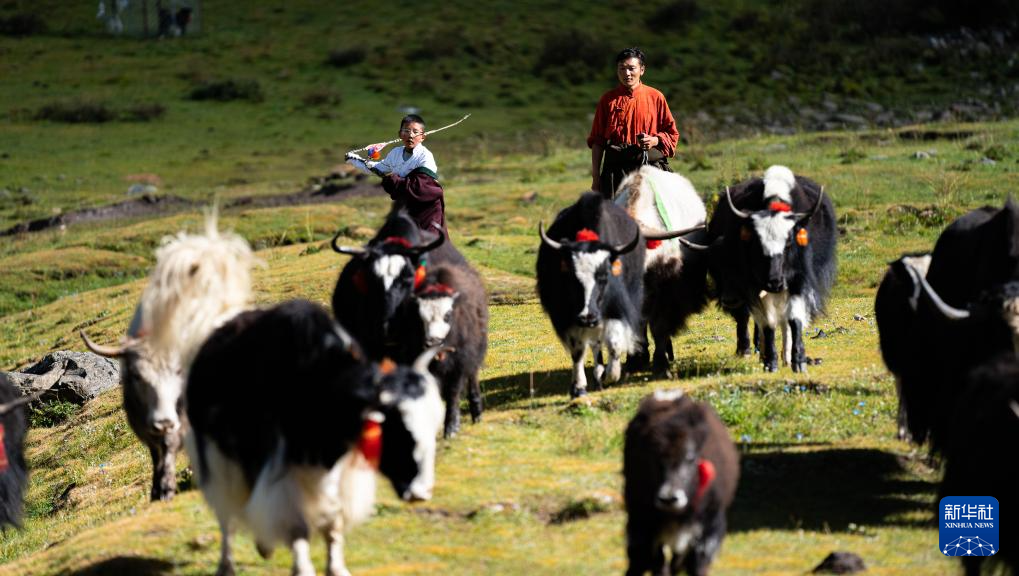 贡乔热旦(左)和父亲王登在自家的夏季牧场放牧(9月4日摄)。新华社记者 丁增尼达 摄