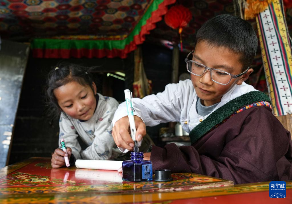贡乔热旦最得意的是自己的藏文书法,每次回家都会在妹妹面前秀上一笔。学校的藏文老师也很严格,每次上藏文朗读课时,学生们都会大声用力,生怕自己的声音不够响亮。
