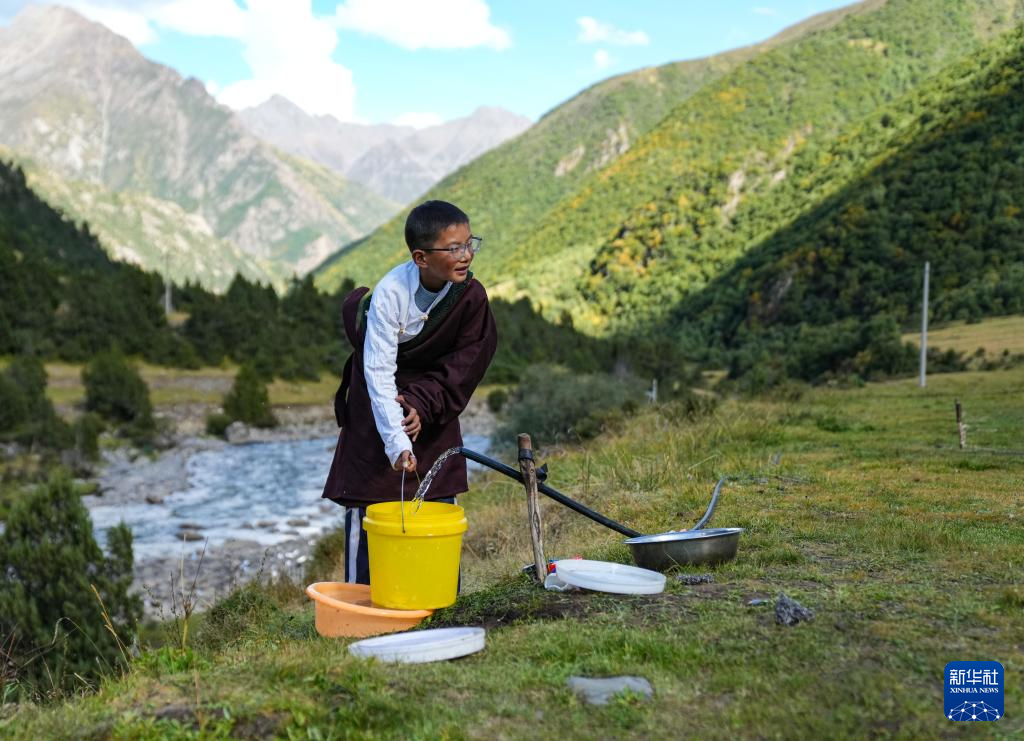 贡乔热旦在夏季牧场帮忙打水(9月4日摄)。新华社记者 晋美多吉 摄