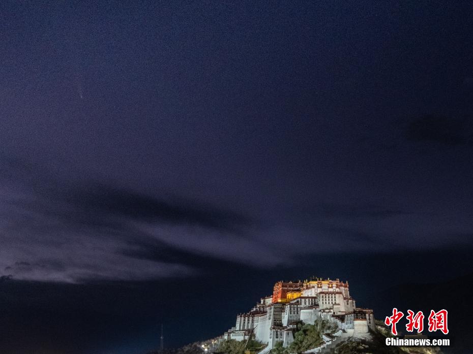紫金山—阿特拉斯彗星(CometTsuchinshan—ATLAS,彗星编号C/2023A3)于2023年初由中国科学院紫金山天文台首次发现,轨道周期为61751年。近日,该彗星连续在西藏拉萨上空“登场”,吸引摄影爱好者“追星”观测。图为10月15日晚,紫金山—阿特拉斯彗星(画面左上角)与拉萨布达拉宫。