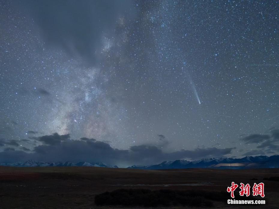 10月23日晚,西藏羊八井,天空中的紫金山—阿特拉斯彗星、银河与夜晚的雪山、草原组成壮丽的自然景观。紫金山—阿特拉斯彗星(CometTsuchinshan—ATLAS,彗星编号C/2023A3)于2023年初由中国科学院紫金山天文台首次发现,近日该彗星连续在西藏天空“登场”。