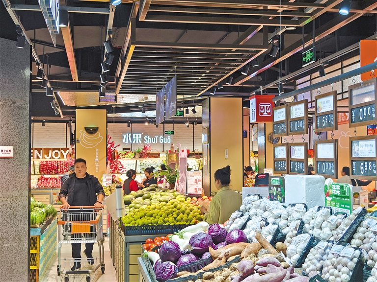 巴宜区西屯超市蔬果区。记者 谢筱纯 王珊 摄