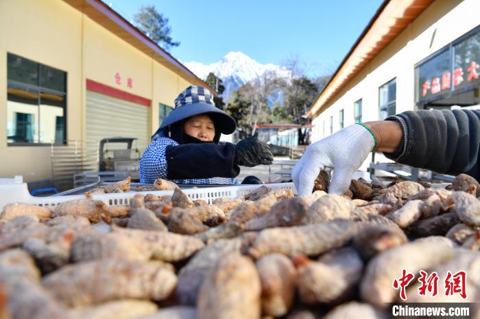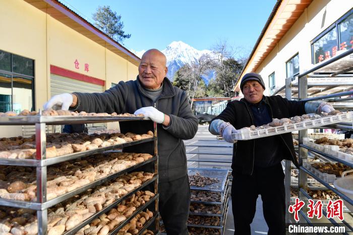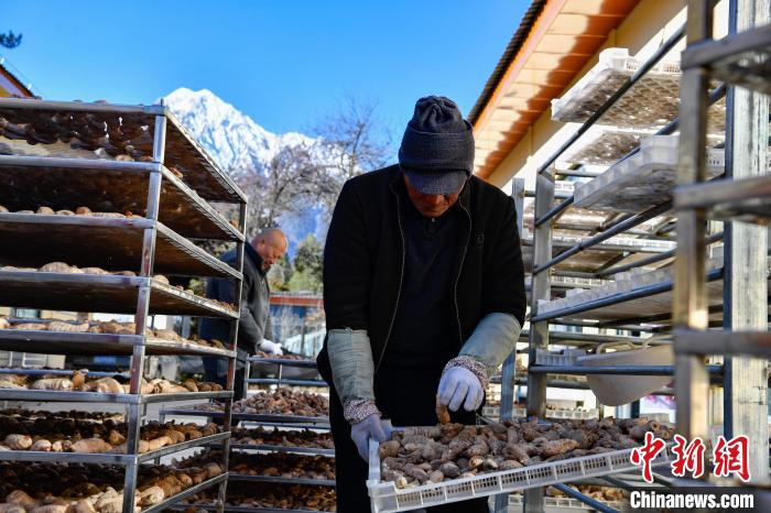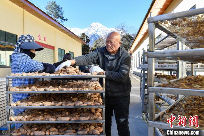 12月18日,在西藏自治区林芝市波密县高原藏天麻产业开发有限公司,村民在晾晒藏天麻。中新社记者 贡嘎来松 摄