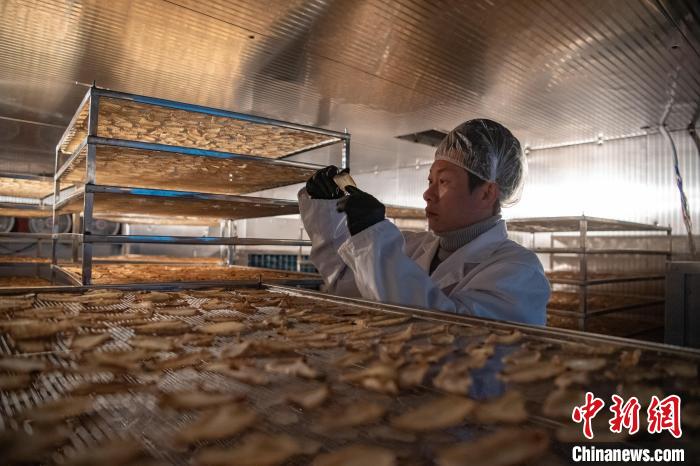 12月18日,在西藏自治区林芝市波密县高原藏天麻产业开发有限公司,工人在查看藏天麻烘干情况。中新社记者 贡嘎来松 摄