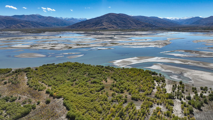 这是雅鲁藏布江宽阔的河床和岸边种植的树木(2024年10月24日摄)。新华社记者 晋美多吉 摄