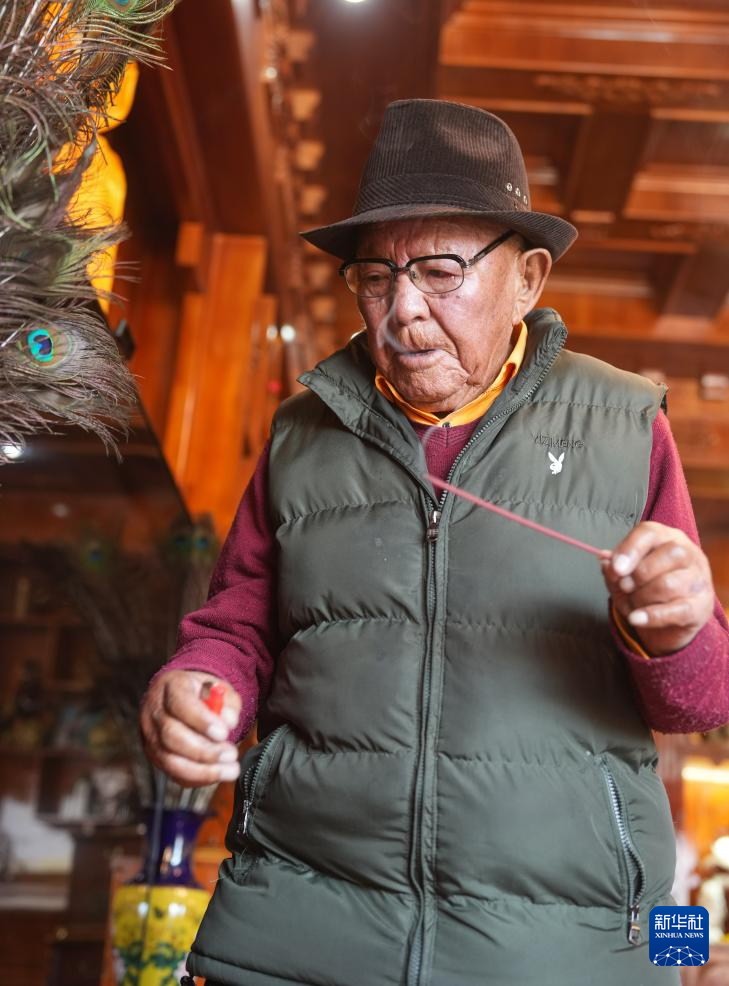 洛桑老人在家点藏香(3月20日摄)。新华社记者 晋美多吉 摄