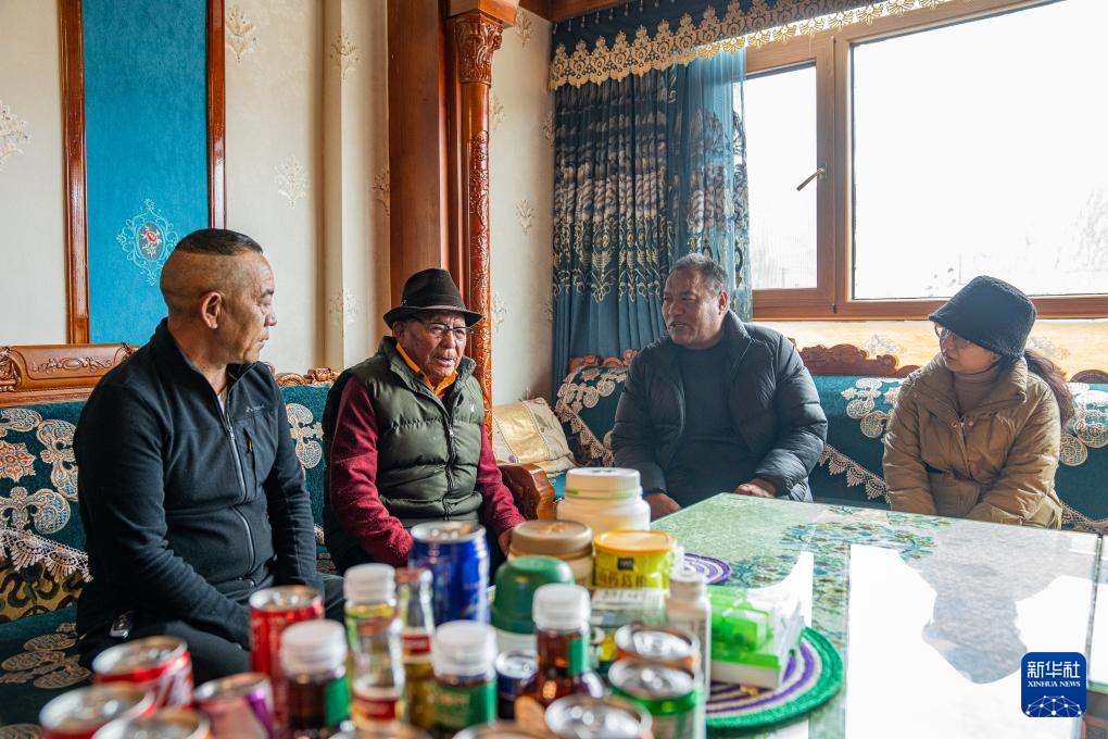 洛桑老人(左二)在家中和儿子及街坊聊天(3月20日摄)。新华社记者 丁增尼达 摄