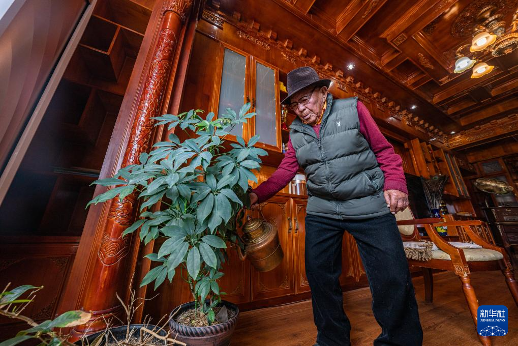 洛桑老人在家中浇绿植(3月20日摄)。新华社记者 丁增尼达 摄