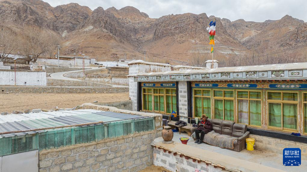 索扎老人在自家院子里听收音机(3月20日摄,无人机照片)。新华社记者 丁增尼达 摄