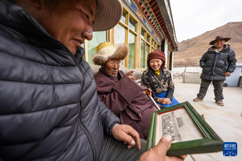 索扎老人和家人观看当年在天安门前拍的照片(3月20日摄)。新华社记者 丁增尼达 摄