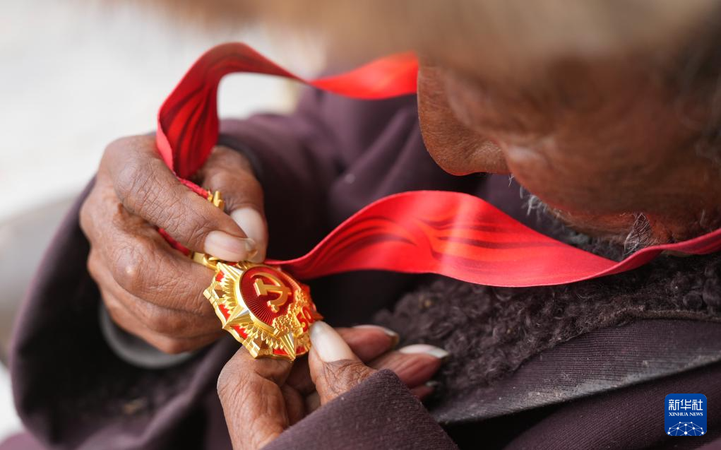索扎老人端详“光荣在党50年”纪念章(3月20日摄)。新华社记者 晋美多吉 摄
