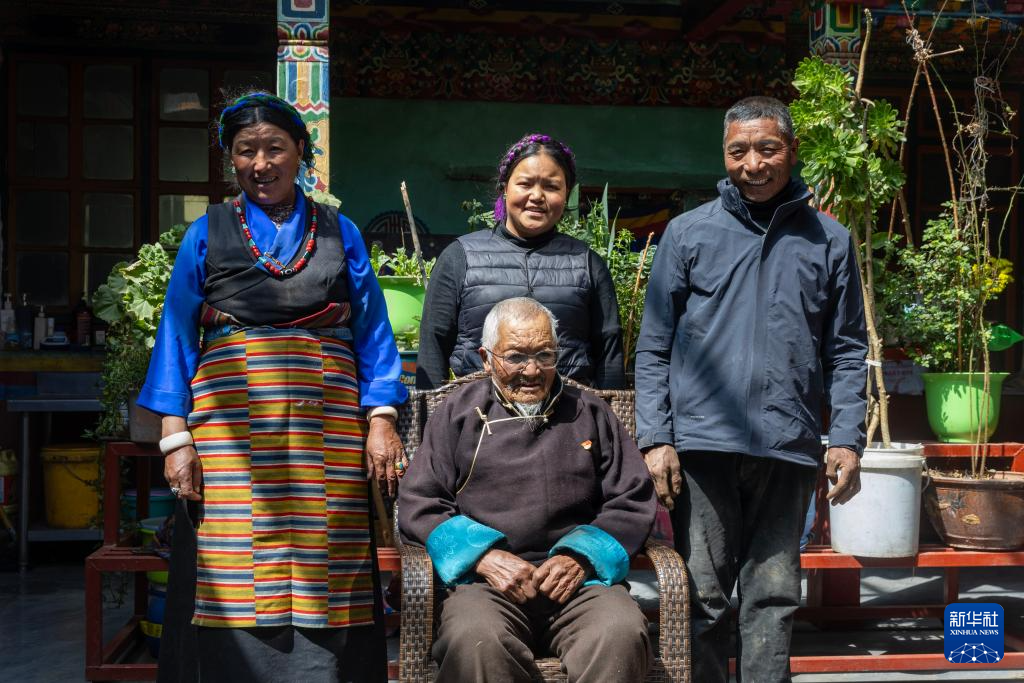 普琼老人(前)与儿子欧珠(后右一)、儿媳曲宗(后右三)、孙女其美拉姆在家中合影(3月17日摄)。新华社记者 姜帆 摄