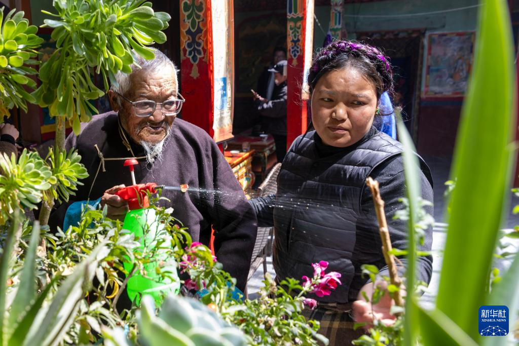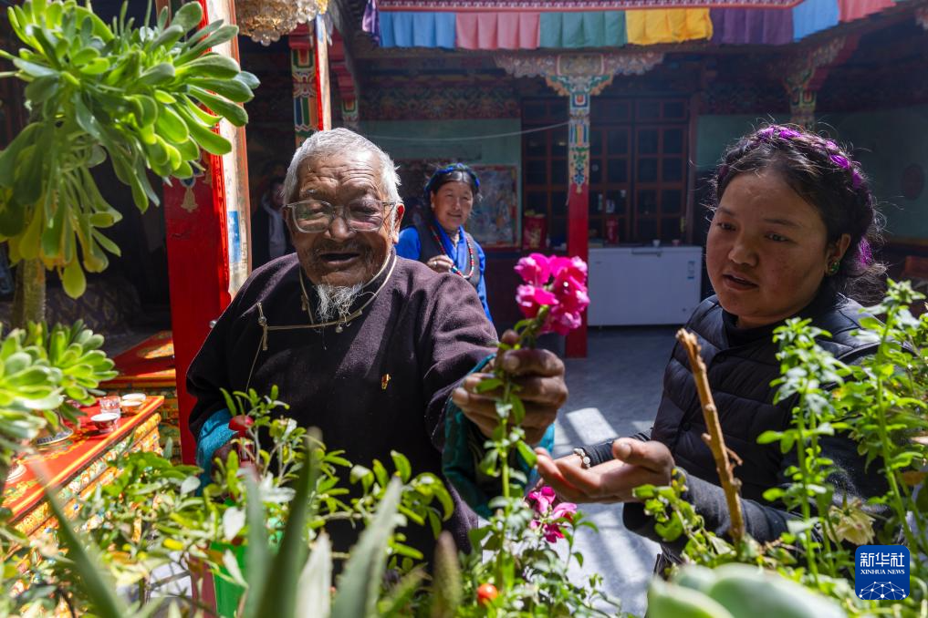 普琼老人(左)在孙女的陪伴下侍弄家中的花(3月17日摄)。新华社记者 姜帆 摄