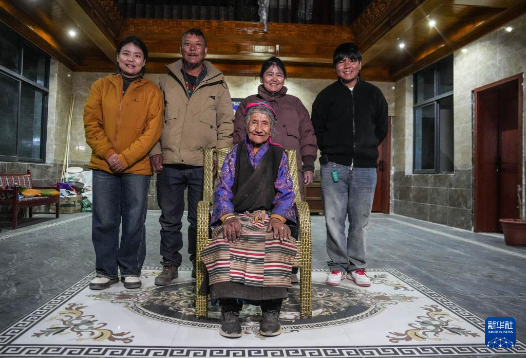 格桑美多老人(前)和家人的合影(3月12日摄)。新华社记者 晋美多吉 摄