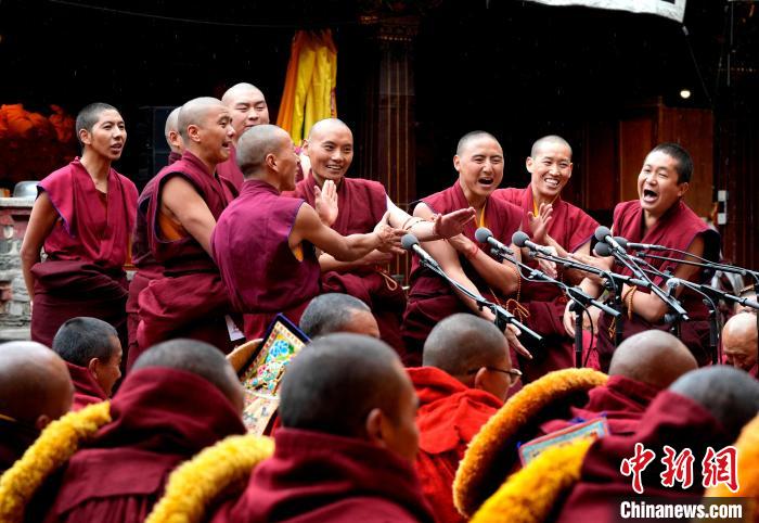 4月15日,西藏自治区2025年度藏传佛教学经僧人考核晋升格西拉让巴学位立宗答辩暨颁证仪式在拉萨大昭寺举行。图为陪考僧人围绕藏传佛教五部经典向考僧提问。李林 摄