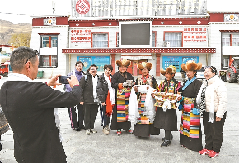 游客在山南市乃东区扎西曲登社区合照留念。