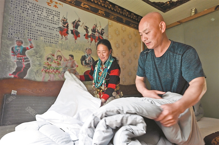 米林市南伊珞巴民族乡,亚达儿与丈夫郑定全在整理民宿房间。记者 白玛泽旺 摄