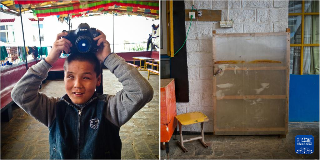 拼版照片:2013年10月9日,达瓦次仁在用相机拍照(左图);达瓦次仁拍摄的照片(右图)。