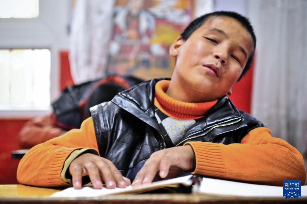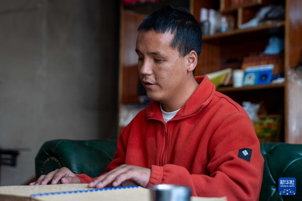 2025年10月10日,达瓦次仁在“阅读”盲文书籍。