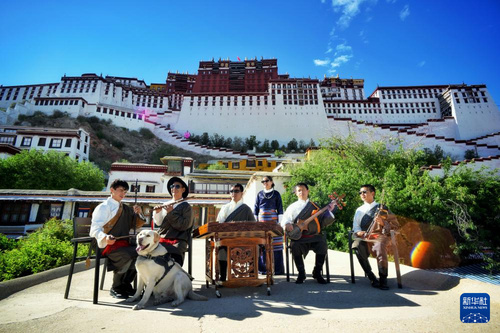 2025年6月17日,咔哒嘎布盲人乐团在布达拉宫前合影。(受访者供图)