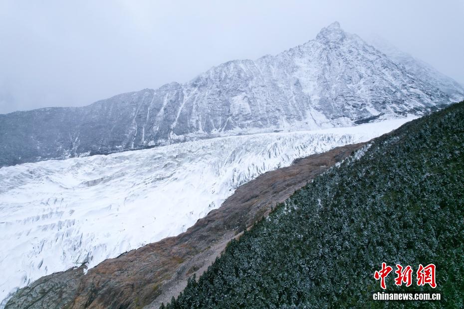 西藏依嘎冰川位于那曲市嘉黎县尼屋乡依嘎村,地处东念青唐古拉山脉深处,是那曲与林芝的交界地带。据悉,依嘎冰川主峰海拔6600米,冰舌末端海拔约4000米,落差达2600米。近日,中新网记者自驾途经依嘎冰川看到,周边山势陡峭、险峻,植被丰富,此外该冰川还拥有冰瀑布以及清晰的冰川纹路等,十分壮阔。图为10月17日,航拍依嘎冰川与周边的原始森林。江飞波 摄