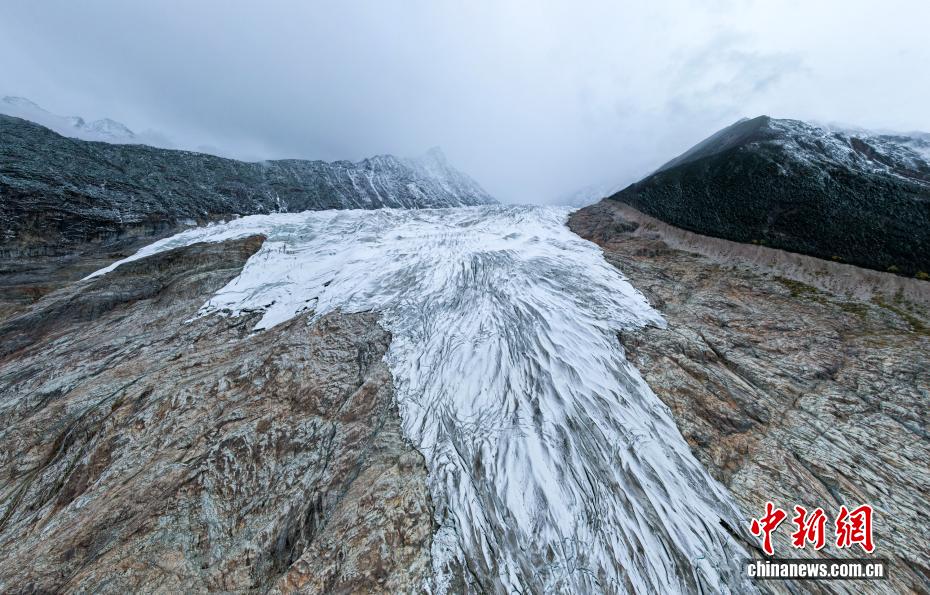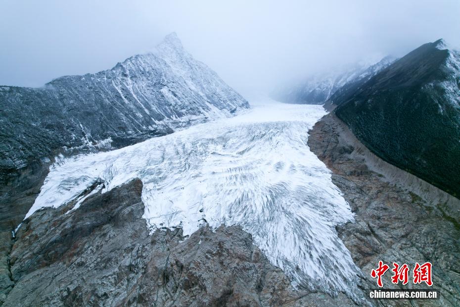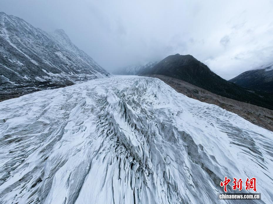西藏依嘎冰川位于那曲市嘉黎县尼屋乡依嘎村,地处东念青唐古拉山脉深处,是那曲与林芝的交界地带。据悉,依嘎冰川主峰海拔6600米,冰舌末端海拔约4000米,落差达2600米。近日,中新网记者自驾途经依嘎冰川看到,周边山势陡峭、险峻,植被丰富,此外该冰川还拥有冰瀑布以及清晰的冰川纹路等,十分壮阔。图为10月17日,航拍依嘎冰川风光。江飞波 摄