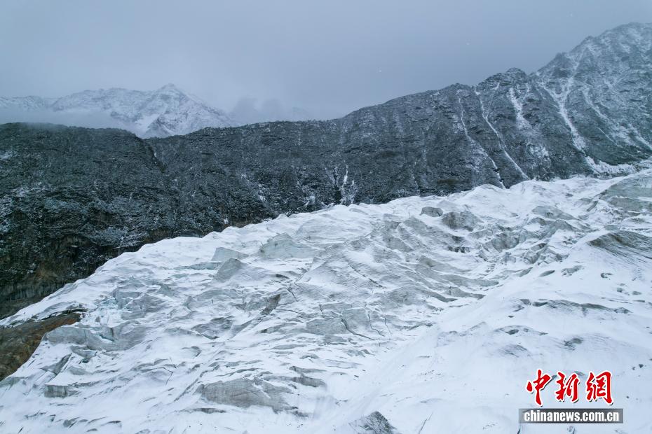西藏依嘎冰川位于那曲市嘉黎县尼屋乡依嘎村,地处东念青唐古拉山脉深处,是那曲与林芝的交界地带。据悉,依嘎冰川主峰海拔6600米,冰舌末端海拔约4000米,落差达2600米。近日,中新网记者自驾途经依嘎冰川看到,周边山势陡峭、险峻,植被丰富,此外该冰川还拥有冰瀑布以及清晰的冰川纹路等,十分壮阔。图为10月17日,航拍陡峭的依嘎冰川。江飞波 摄