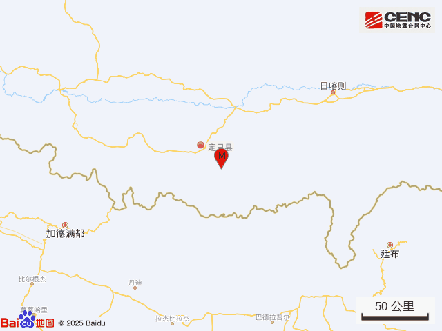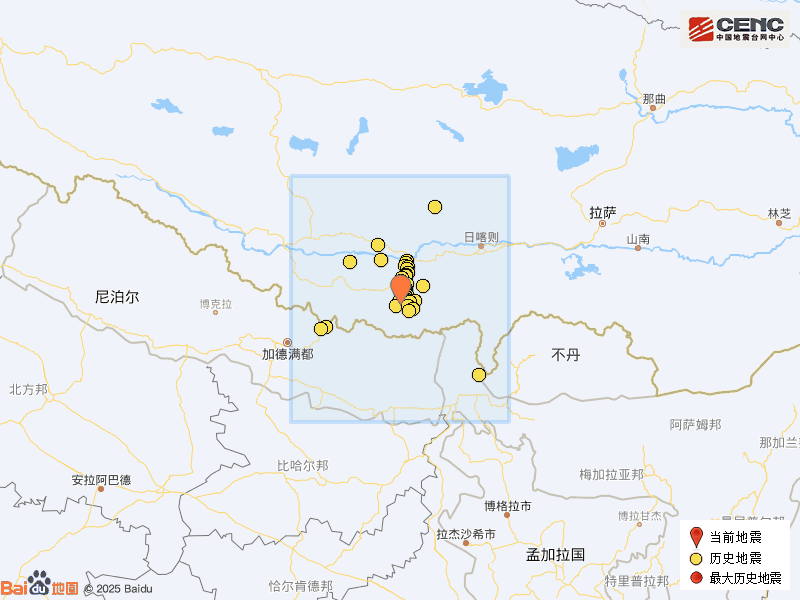 历史地震:根据中国地震台网速报目录,震中周边200公里内近5年来发生3级以上地震共132次,最大地震是2025年1月7日在西藏日喀则市定日县发生的6.8级地震(距离本次震中9公里),按震级大小前50次历史地震分布如图。