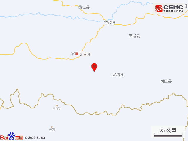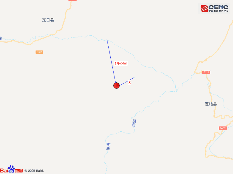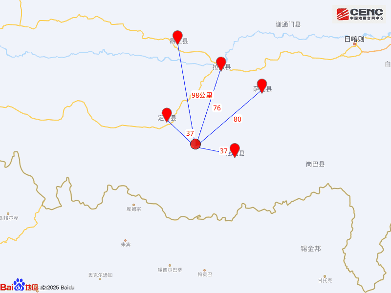 周边县城:震中距定日县37公里、距定结县37公里、距拉孜县76公里、距萨迦县80公里、距昂仁县98公里,距日喀则市172公里,距拉萨市386公里。