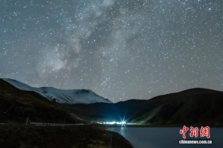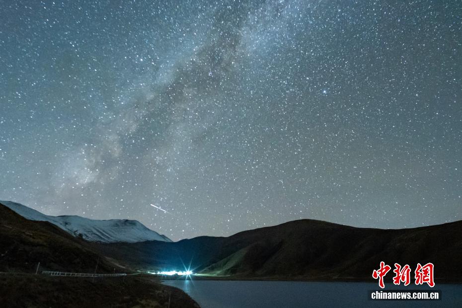 西藏羊卓雍错简称羊湖,藏语意为“碧玉湖”,湖面海拔4400多米,是西藏三大“圣湖”之一。近日,今年的狮子座流星雨达到峰值,每小时约能看到15颗流星。中新网记者在羊湖畔拍摄到初冬的羊湖银河及狮子座流星划过高原夜空等画面。图为11月16日晚,一颗流星划过羊湖湖畔村庄附近的雪山上空。江飞波 摄