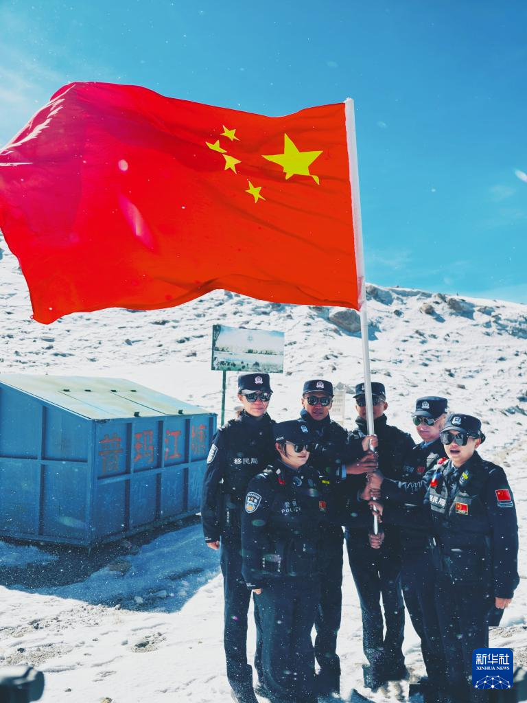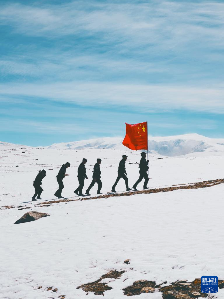 海拔5600米,在岗布冰川的注视下,鲜红的五星红旗和移动的藏蓝身影,成为天地间最醒目的色彩。他们攀上冰碛垄,踏查边境情况,不放过任何一丝异常。