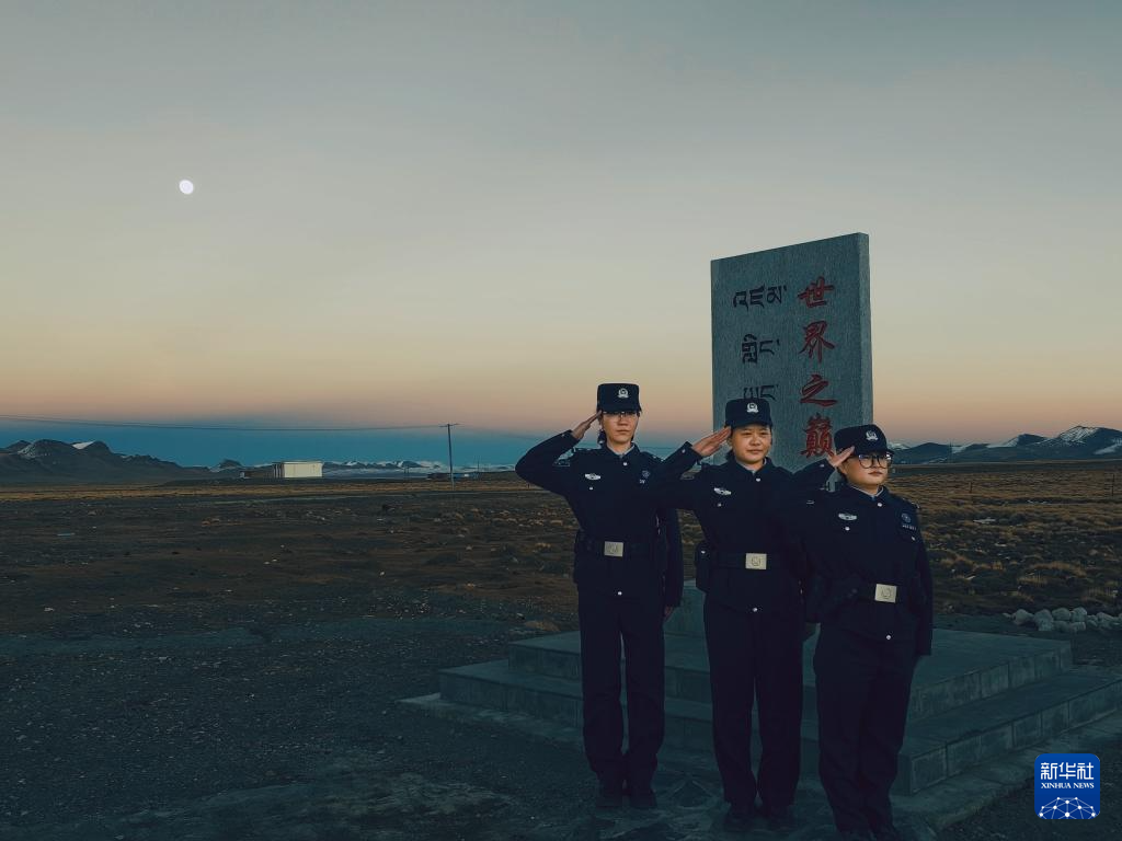 11月4日,月光下戍守普玛江塘的三位女民警武慧、李红炎、李天娇(从左至右)。新华社记者 任沁沁 摄