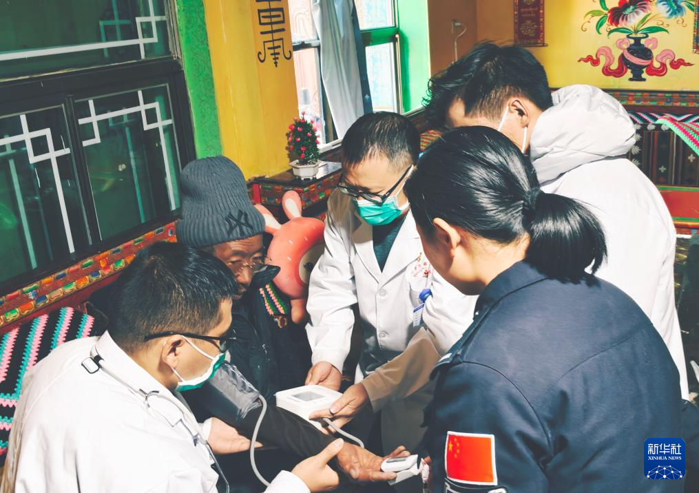 11月6日,普玛江塘边境派出所民警与湖南省援藏医生江志超、赵启等一同到牧民家中义诊。新华社记者 任沁沁 摄
