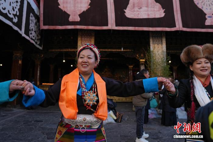 11月28日,随着藏历十月十五白拉姆节临近,连日来,拉萨及周边信众身着色彩艳丽的藏装节日盛装,手持从家中精心准备的头等青稞酒、新收的青稞及新鲜水果,陆续前往大昭寺、色拉寺、哲蚌寺等寺庙朝拜祈福。大昭寺内,信众敬献供品后载歌载舞,歌声悠扬、舞步轻快,尽显节日喜悦。白拉姆节又称 “仙女节”。相传,白拉姆是拉萨地区的保护神,是藏传佛教最高护法神之一班丹拉姆的女儿。白拉姆曾与大昭寺护法神赤尊赞相互爱慕并私定终身,其母亲班丹拉姆发现后,赤尊赞被赶到拉萨河南岸,每逢藏历十月十五日,二人才能隔河相见一次。图为白拉姆节临近之际,信众在大昭寺内敬献供品后载歌载舞的场景。贡确 摄