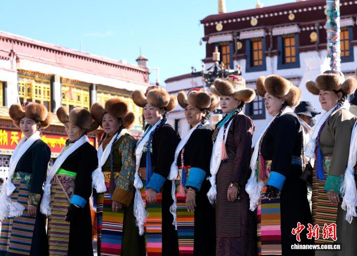 图为拉萨妇女盛装在大昭寺广场合影。中新社记者 李林 摄
