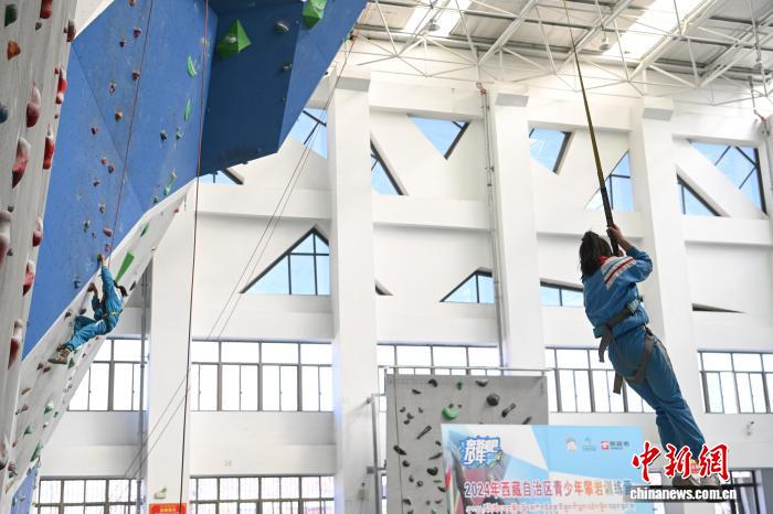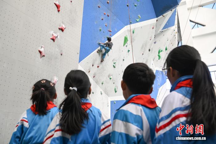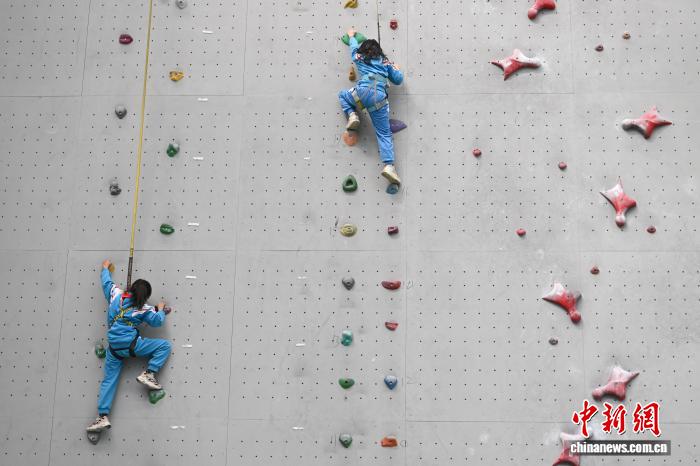 12月5日,西藏登山队在拉萨市实验小学持续推进“攀岩进校园”兴趣班活动。据悉,该兴趣班自2025年5月开设,面向三四年级学生,每周星期五下午组织40余名学生前往西藏自治区竞技体育管理中心攀岩馆,开展攀岩技术学习与兴趣培养。图为拉萨市实验小学的学生在学习攀岩。中新社记者 贡嘎来松 摄