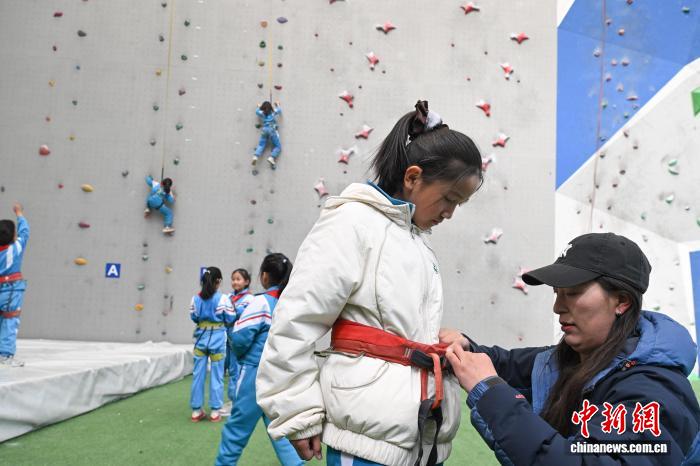 图为登山队员帮学生穿戴攀岩装备。中新社记者 贡嘎来松 摄