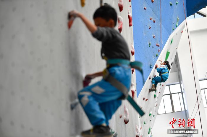 图为拉萨市实验小学的学生在学习攀岩。中新社记者 贡嘎来松 摄