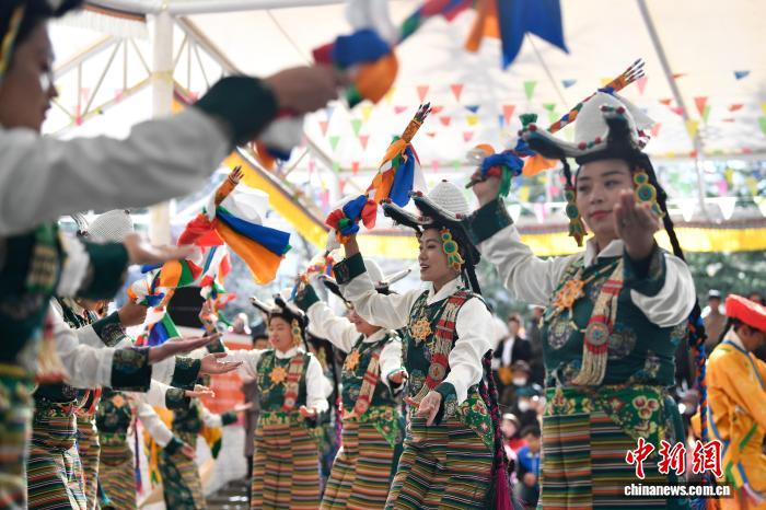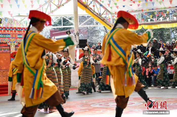 图为城关区雪民间藏戏艺术团表演歌舞《扎西央恰》。贡嘎来松 摄
