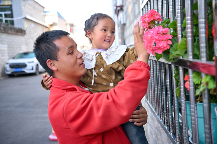 10月10日,达瓦次仁在陪大女儿丹增曲音玩耍。新华社记者张铖摄