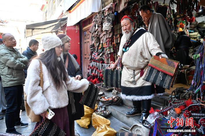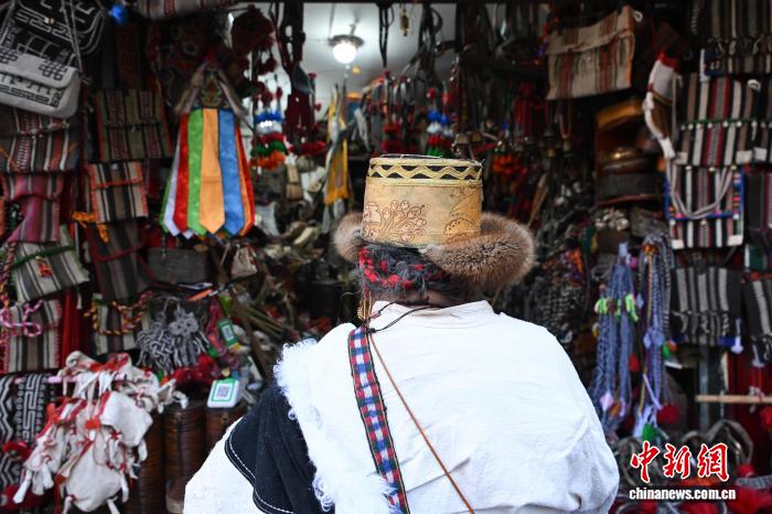 12月9日,西藏拉萨市八廓街冲赛康旁的背阴巷口,55岁店主次仁罗布的藏式老物件小店热闹非凡。不足30平方米的空间里,乌朵、马包、藏式氆氇侧挂包等好物琳琅满目,既有时光沉淀的老物件,也有手艺人新制精品。小店吸引本地民众、年轻人及游客纷纷选购,生意红火。图为游客选购藏式氆氇侧挂包。中新社记者 贡嘎来松 摄
