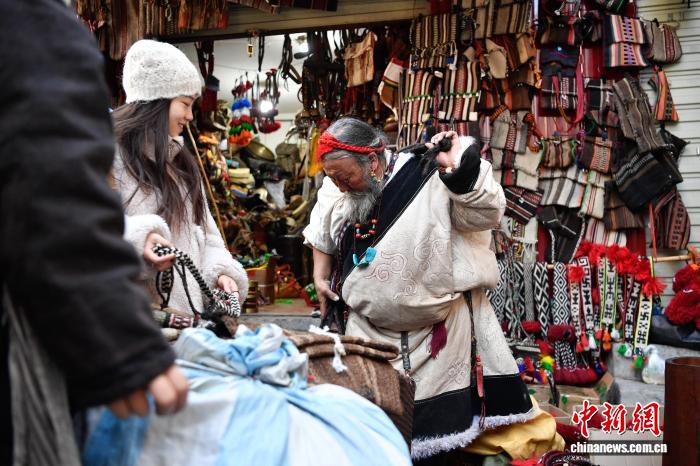 图为藏式老物件店主次仁罗布给游客推荐藏式氆氇侧挂包。中新社记者 贡嘎来松 摄