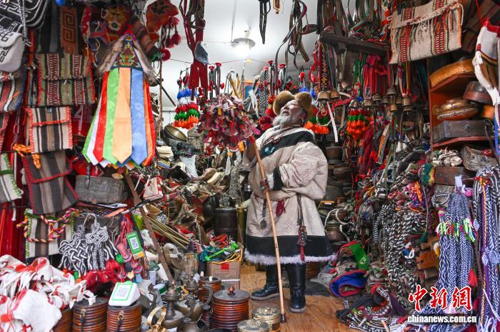 图为次仁罗布在藏式老物件小店内工作。中新社记者 贡嘎来松 摄