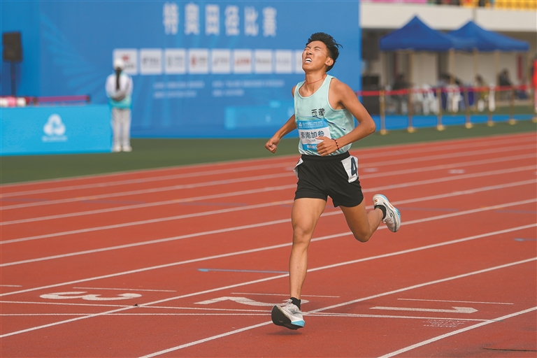 12月11日,索南加参在全国残特奥会特奥田径比赛男子16—21岁组800米决赛第7组比赛中率先冲过终点。新华社记者 杨晨光 摄